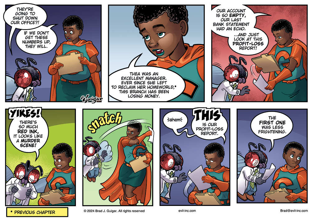 Panel 4: Dr Muskiday: "Yikes! There's so much red ink, it looks like a murder scene!"