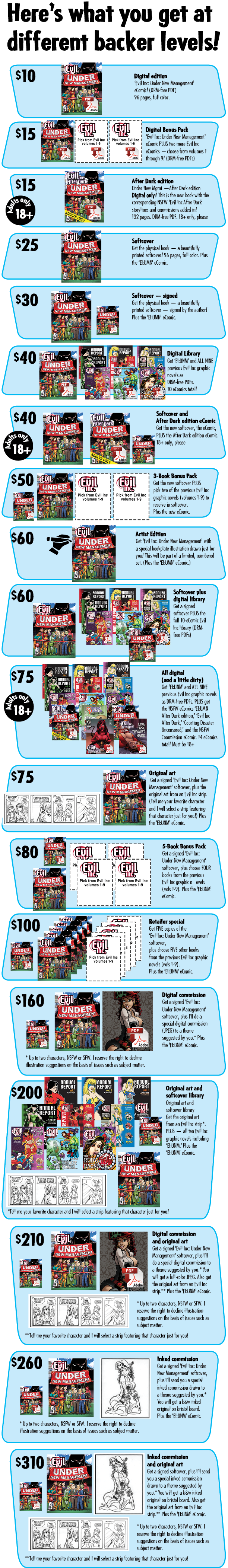 I'm very happy to announce the Kickstarter campaign for the newest Evil Inc graphic novel, "Under New Management." Longtime readers will know that Evil Inc was launched in 2005 as a comic strip, and then relaunched in 2016 as an online graphic novel. This new book — "Evil Inc: Under New Management" — collects the first two years of that relaunch. Here are the details: