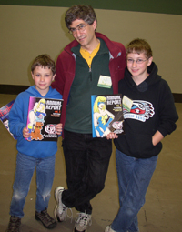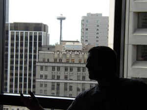 We were checked in to the Grand Hyatt in Seattle. What an amazing hotel. That’s Dave in front of our amazing view in the photo to the right. I had shipped seven boxes to the hotel over the course of the weekend. In the past, this has been a source of extreme confusion and delay. Not only were my boxes waiting for me, but they were brought up to my room immediately. And when I explained Friday night that I was waiting for a shipment the next day, they took my cell phone number so they could call me on the convention floor when the shipment arrived. AND THEN THEY DID! The hotel was about a block from the Washington State Convention Center. I was able to scamper to the hotel and back in less than fifteen minutes, which was nice because the last-minute shipment was more copies of the How To Make Webcomics book, which we would have surely run out of otherwise.