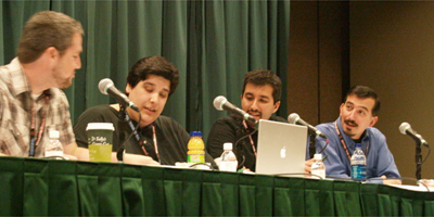 Sunday morning brought the Webcomics Weekly panel at 11 a.m. We were worried that no one would show up so early on a Sunday. Boy, were we wrong. The auditorium was packed and we did a live version of our podcast to a receptive and supportive audience.
