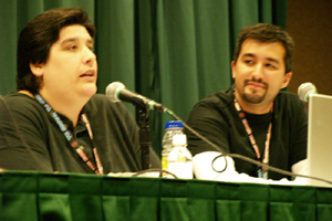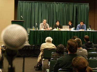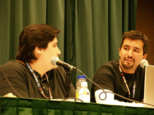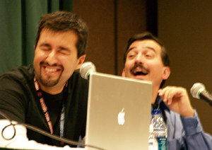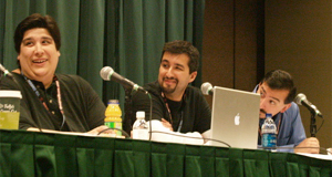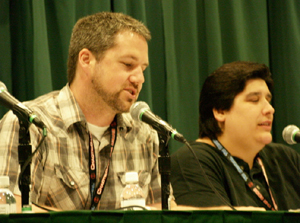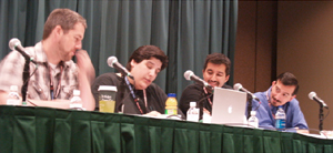 Thanks to my friend Aaron Albert from About.com: Comic Books, I’ve got a few more photos to share from Emerald City Comic Con — mostly of the How To Make Webcomics panel. We’ll kick it off with a shot of Kris’ eardrums shattering at the onslaught of my Nuclear-powered chortle. Enjoy.