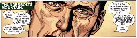 Take his cucumber-cool response to seeing his Thunderbolts team obliterated in Michael-Phelps-time when their stronghold is attacked by the Captain Marvel Skrull. It happens in Secret Invasion #5. Megatons of meta-ability lay prostrate at his loafers, and Norman bests the Skrull with exactly 169 words. (Click on the panel above for start-to-finish action.)