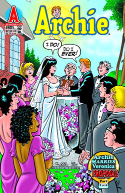 They say: Prepare to be shell-shocked, because not only did Archie propose, but in this issue wedding bells are ringing! It’s Archie’s future, a future where Riverdale’s favorite rich girl wins his hand in marriage! With Mr. Lodge footing the bill, it’s proving to be the most spectacular wedding ever to hit Riverdale! The guys look spiffy in their tuxes, the girls are gorgeous in their gowns, but just who is Betty’s date, Henry? Witness Archie’s poignant heart-to-heart talk with Betty before the nuptials, the choked-up parents of the betrothed, and a surprise ending that will leave you speechless!