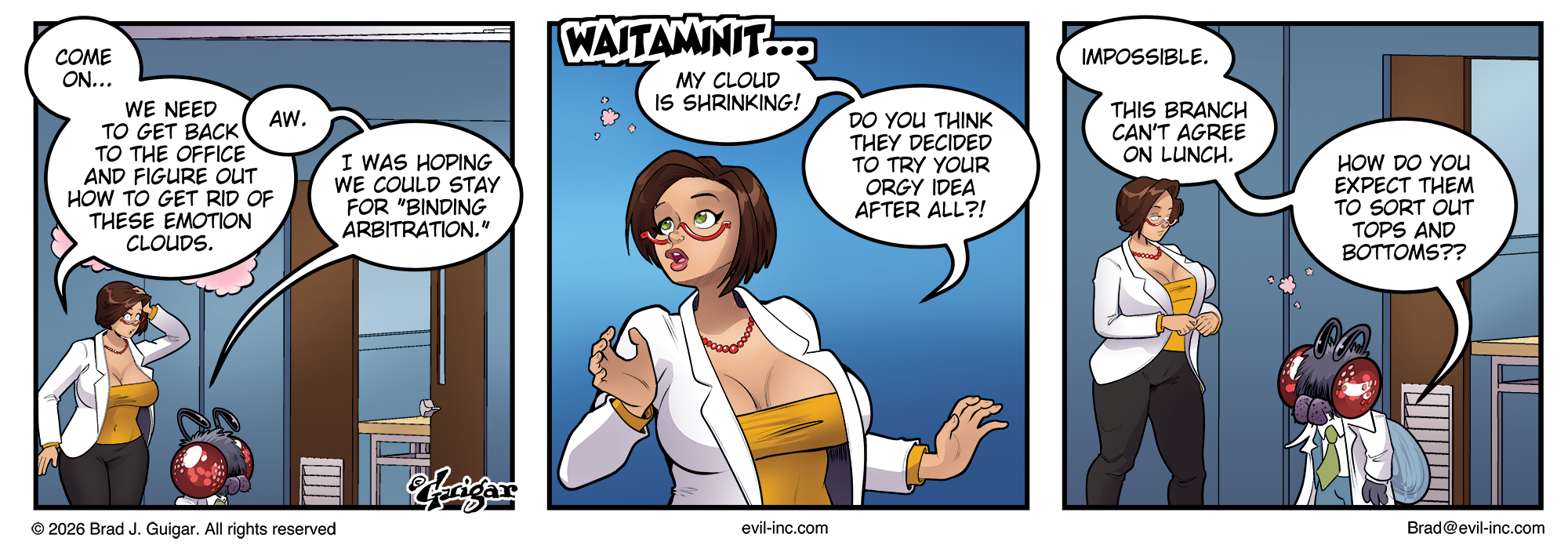 A three-panel comic set inside an office at Evil Inc.