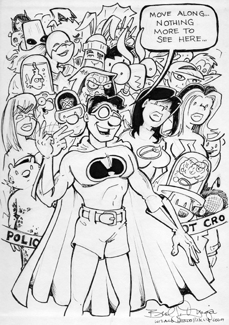 And I closed it with the illustration above, a group shot featuring several Evil Inc cast members along with a whole slew of characters from the book.