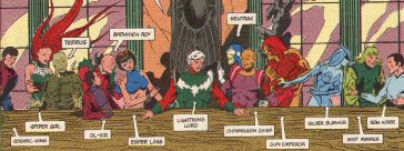 13. Legion of Super-Villains: The team was originally comprised of Cosmic King, Lightning Lord, Saturn Queen, Radiation Roy, Ron-Karr, Spider Girl and Nemesis Kid with the objective being a school for super-villains. The team was formed by Tarik the Mute, who had suffered irreparable damage to his vocal cords during a battle between the Science Police and who subsequently developed a pathological hatred of law and order. Any team formed by a man with Homicidal Laryngitis deserves the lowest position on this list. The second incarnation of the group (pictured to the right) was headed by Nemesis Kid (What? –“Villain Boy” was already taken?), and it was the more successful team.