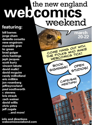 Webcomics Weekend, in Easthampton, Mass., is this weekend! It’s going to be a tremendous meet-up of some of the very best in webcomics. And me. All four Halfpixelites will be in attendance: Dave Kellett, Kris Straub, Scott Kurtz and me. Check out this site for details!