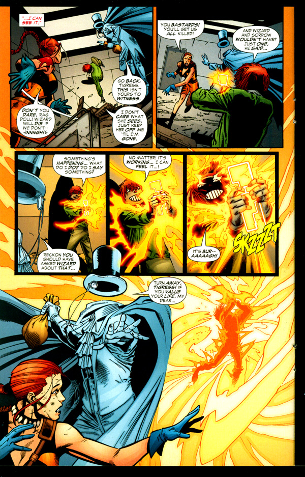 Back in JSA Classified #5-7, in the Injustice Society arc (such a well-done story, by the way), Rag Doll buys the farm handling the Cosmic Key (and in so doing, brings Johnny Sorrow back to the material plane). (Once again, click on the image to see a larger version.) But, of course, you can’t swing a dead cat in the DC universe without hitting someone who’s spent some quality time in a coffin.